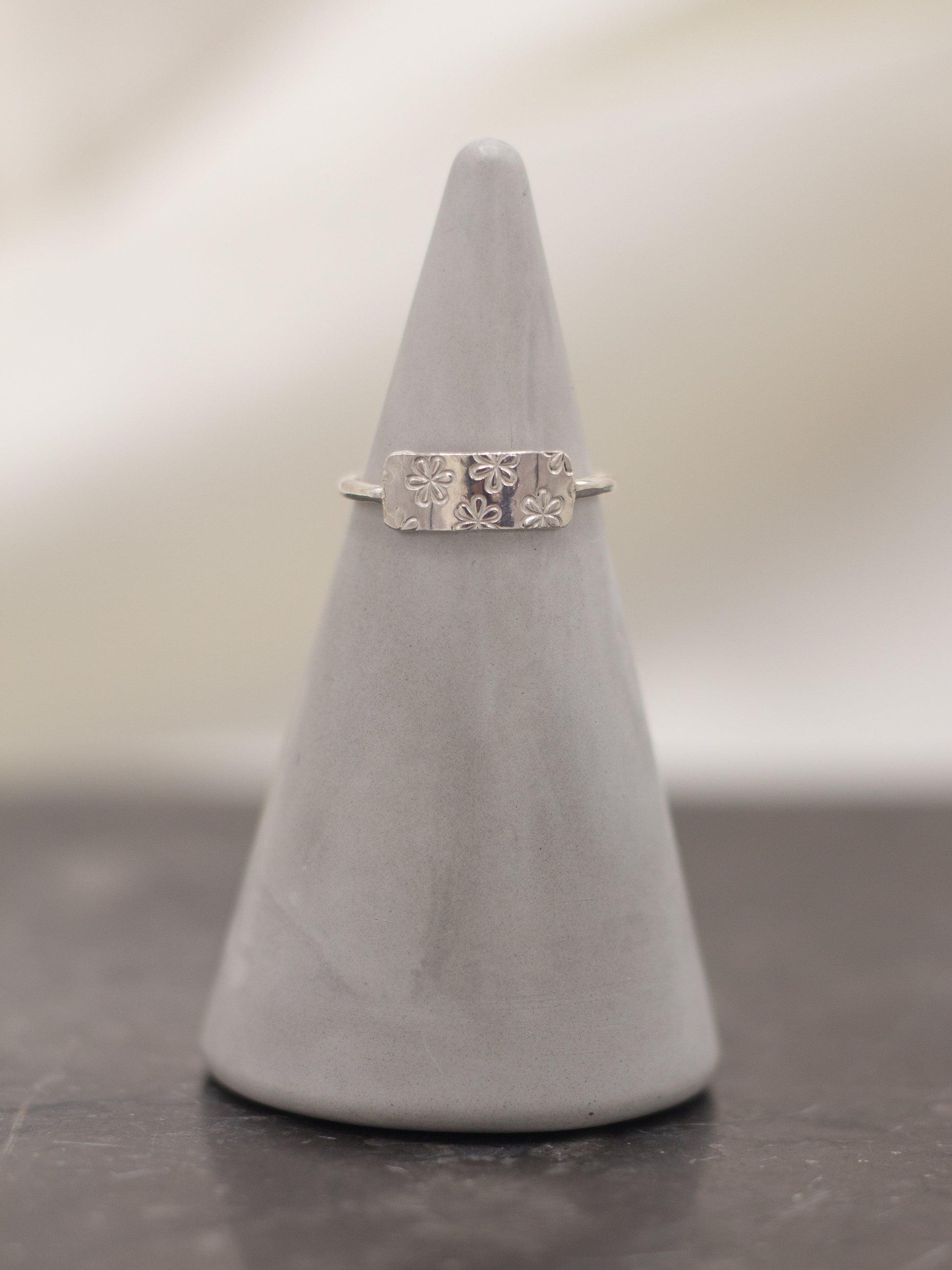 hand-stamped blossoms paired with a delicate band, handcrafted with sterling silver or 14k gold-fill.
