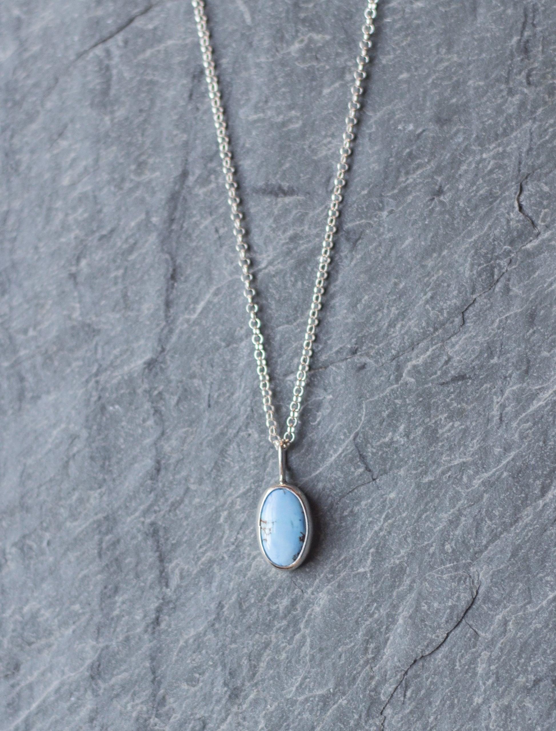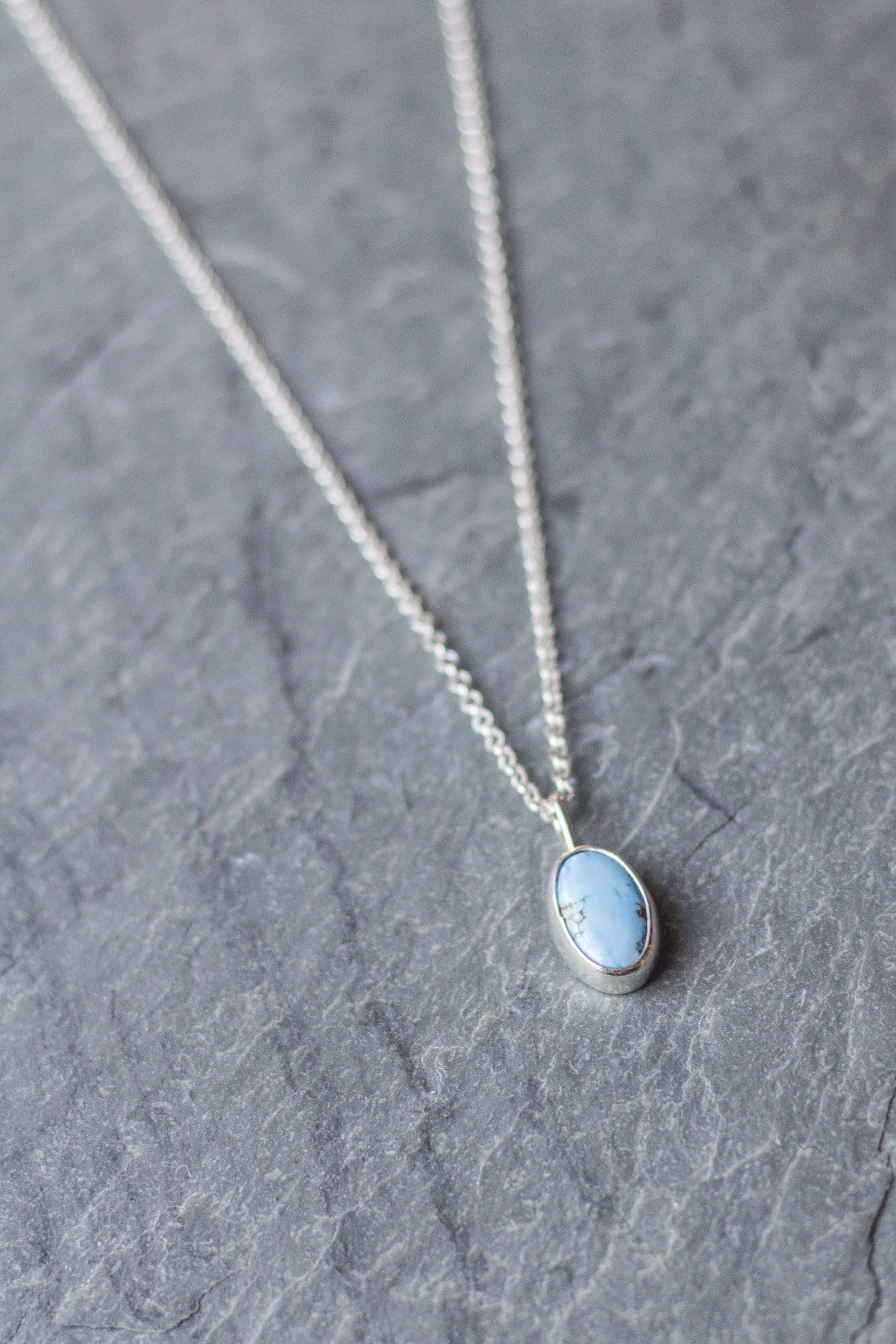 Golden Hills turquoise set in a hand-built bezel, made with sterling silver + dangling on a sterling silver chain (adjustable between 16, 18 and 20 inches)