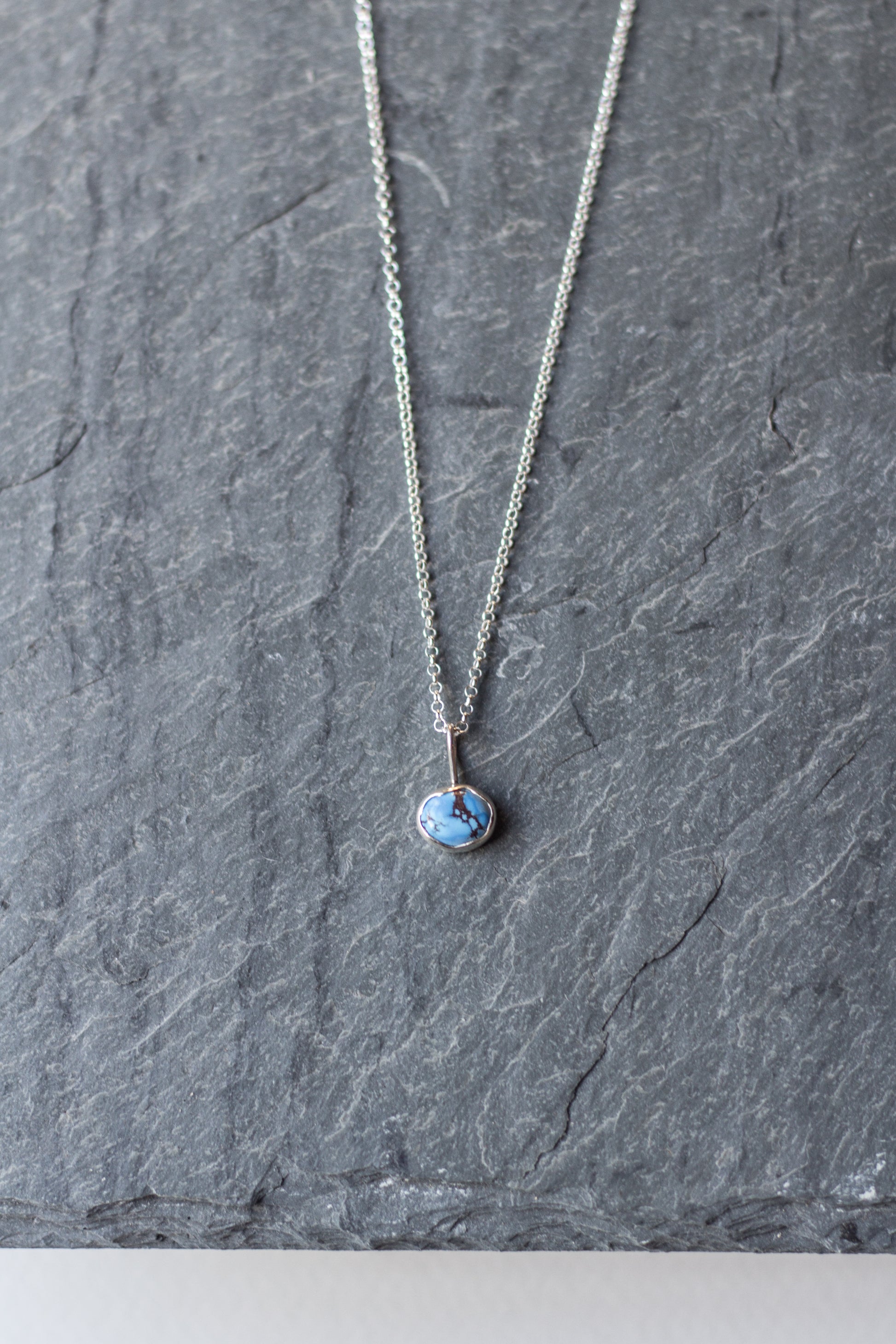 golden hills turquoise set horizontally in a hand-built bezel, made with sterling silver + dangling on a sterling silver chain (adjustable between 16, 18 and 20 inches)