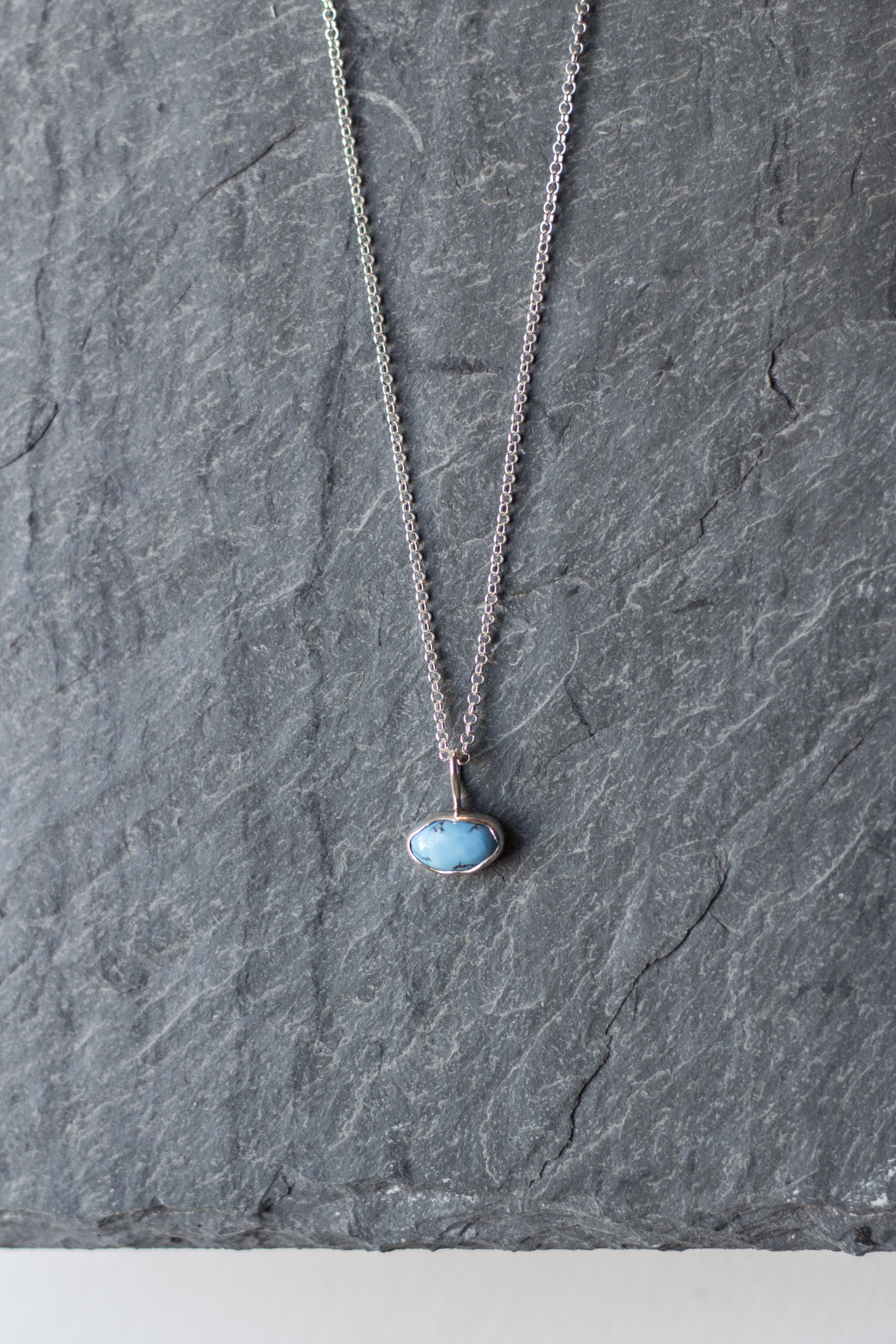 golden hills turquoise set horizontally in a hand-built bezel, made with sterling silver + dangling on a sterling silver chain (adjustable between 16, 18 and 20 inches)