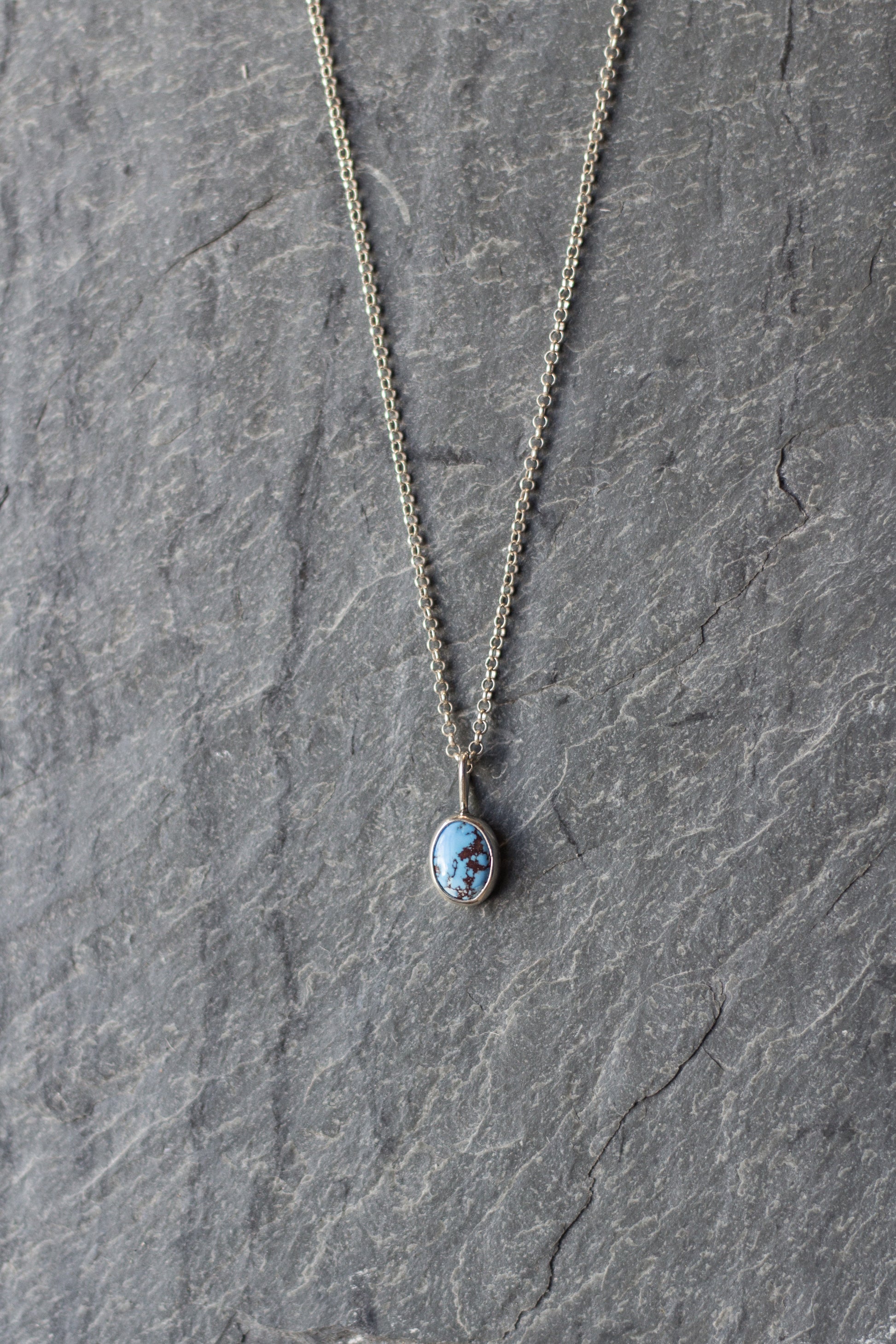 golden hills turquoise set in a hand-built bezel, made with sterling silver + dangling on a sterling silver chain (adjustable between 16, 18 and 20 inches)