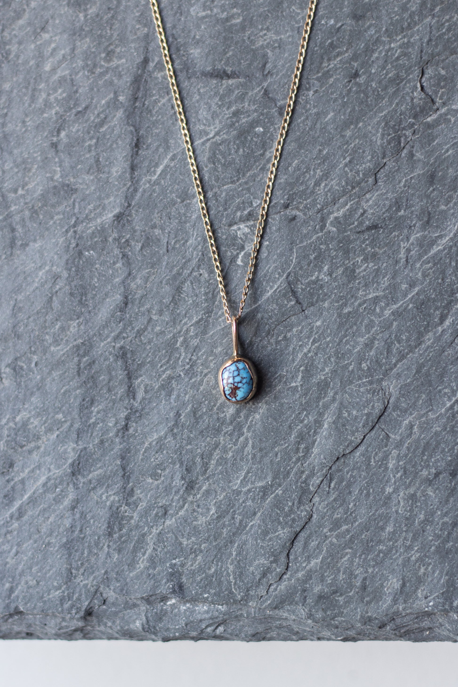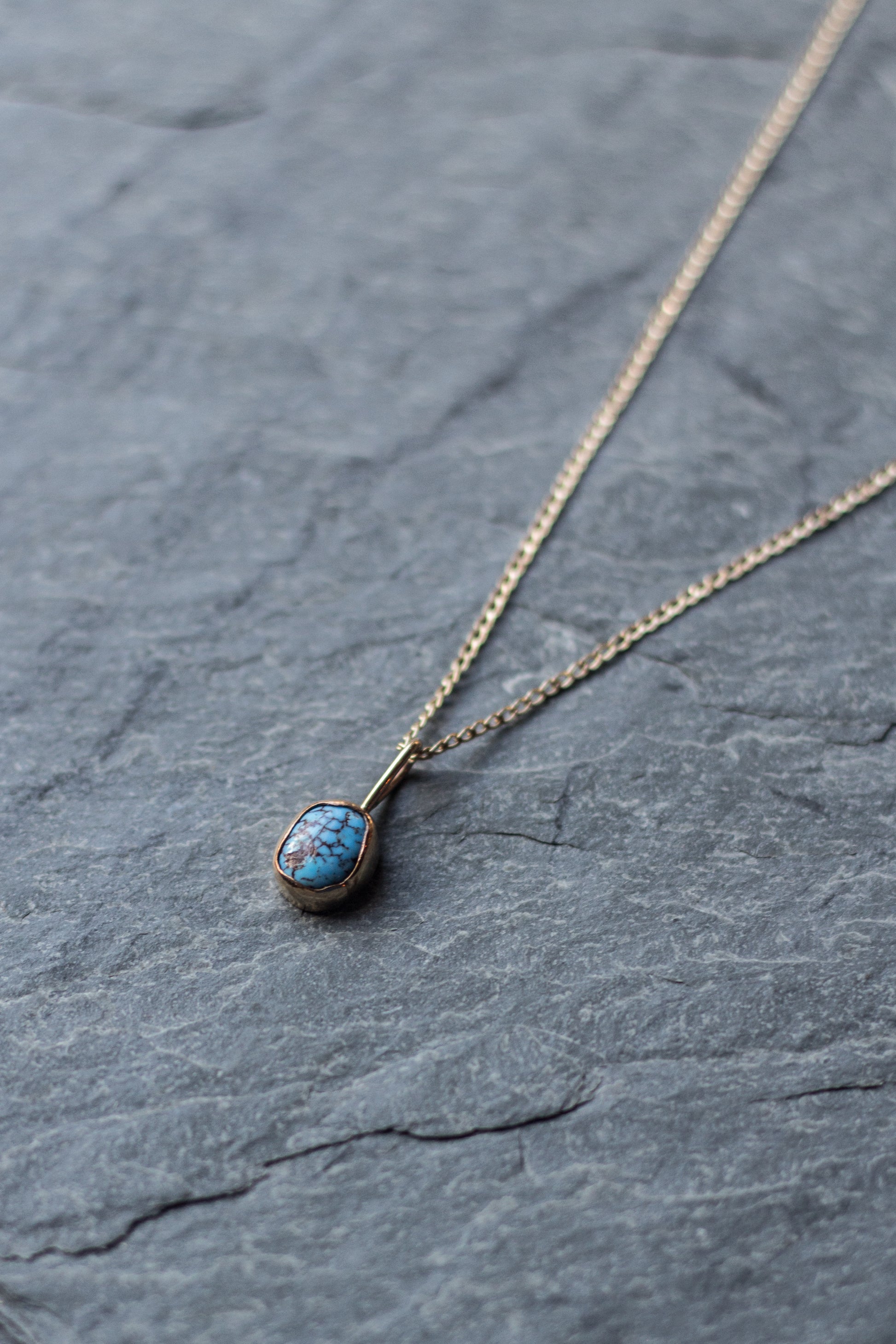 mini golden hills turquoise set in a hand-built bezel, made with 14k gold-fill + dangling on an 18 inch 14k gold-fill chain