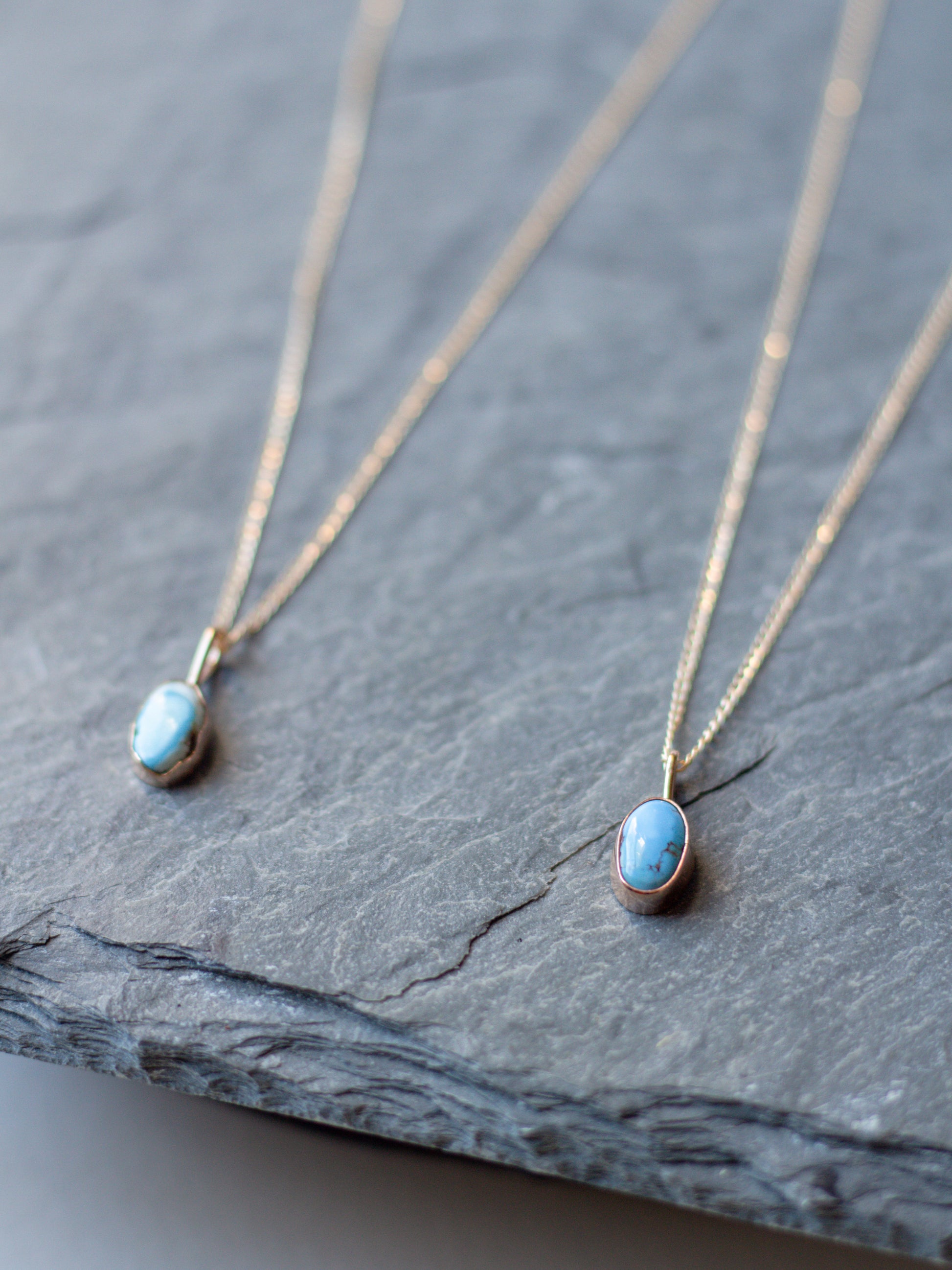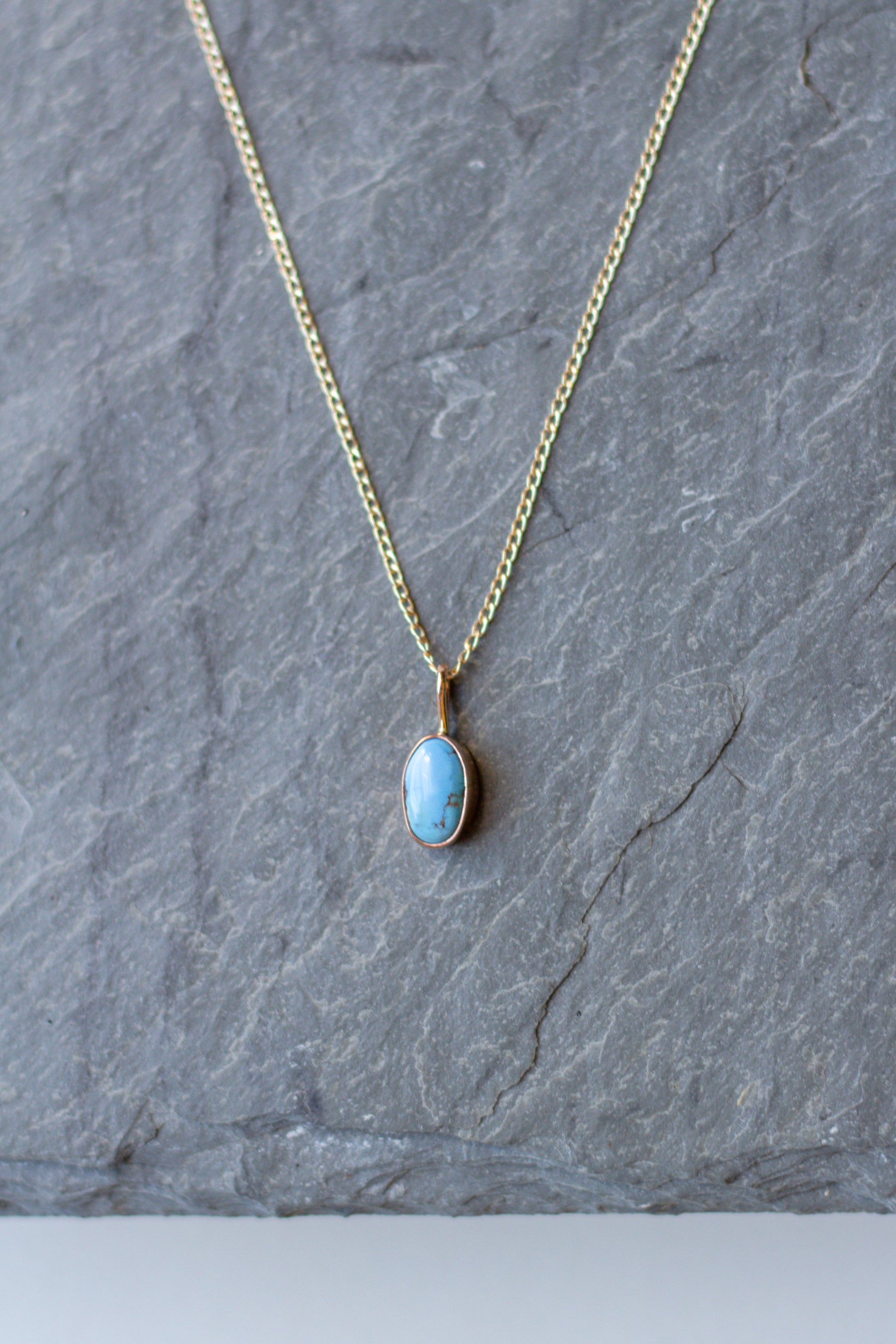golden hills turquoise set in a hand-built bezel, made with 14k gold-fill + dangling on an 18 inch 14k gold-fill chain