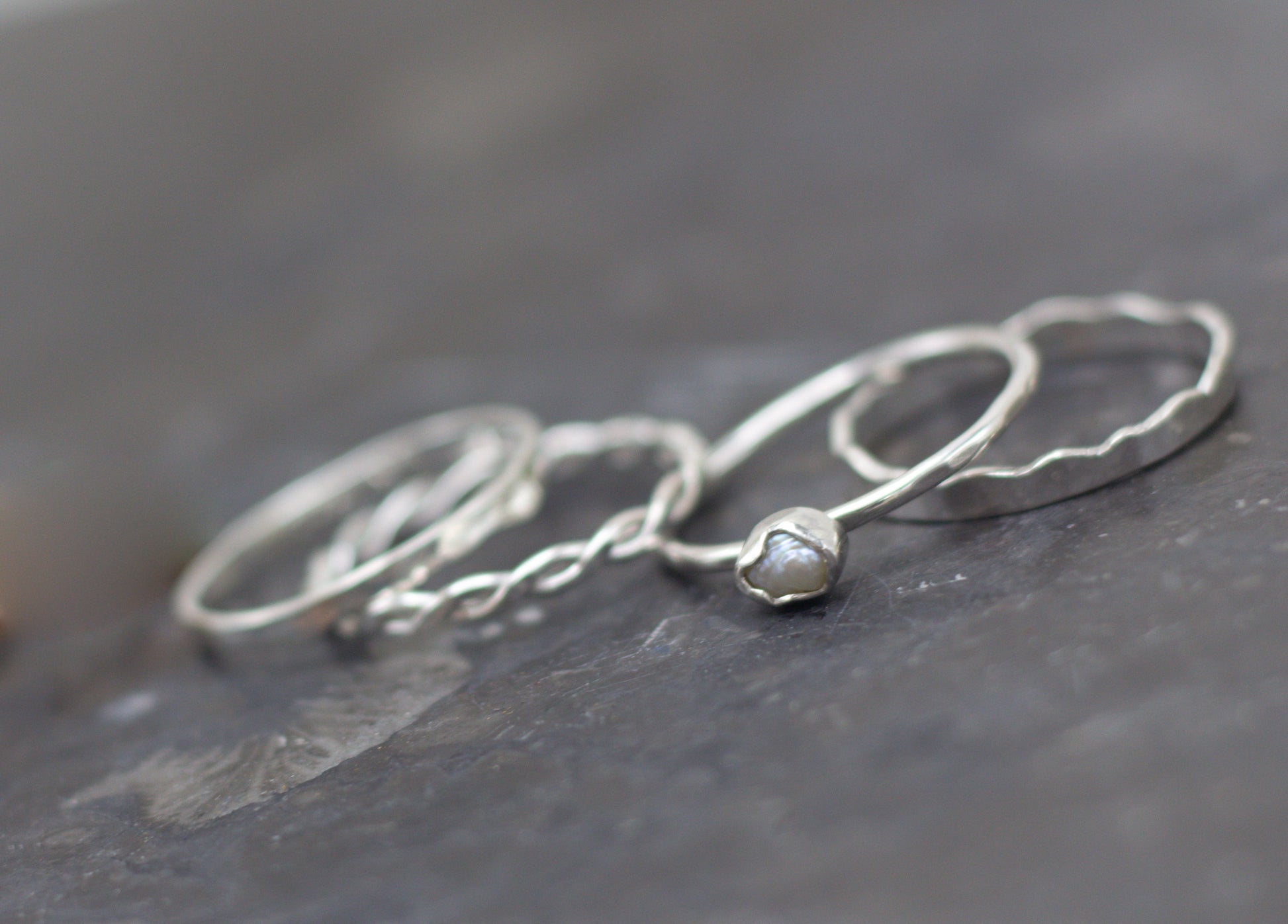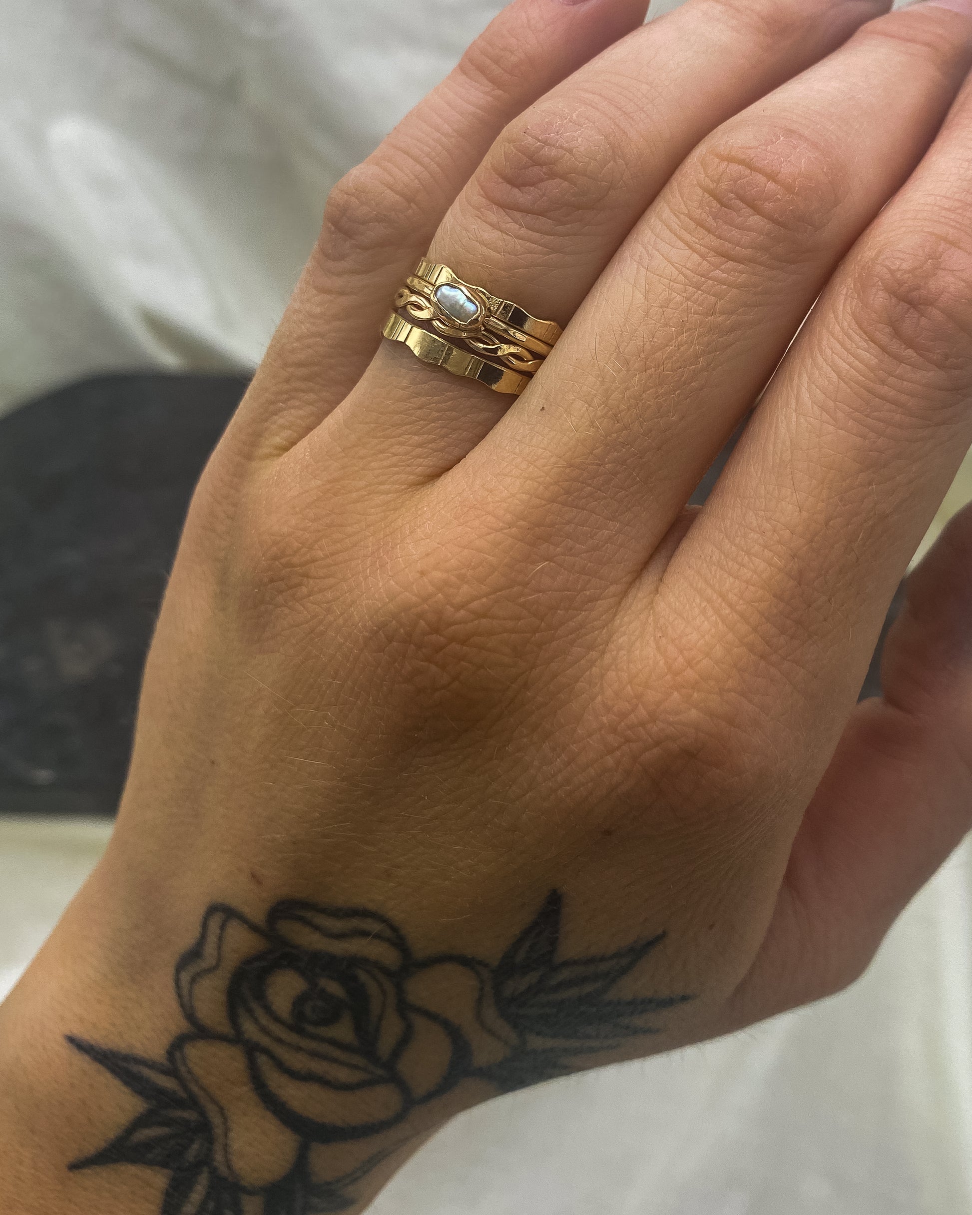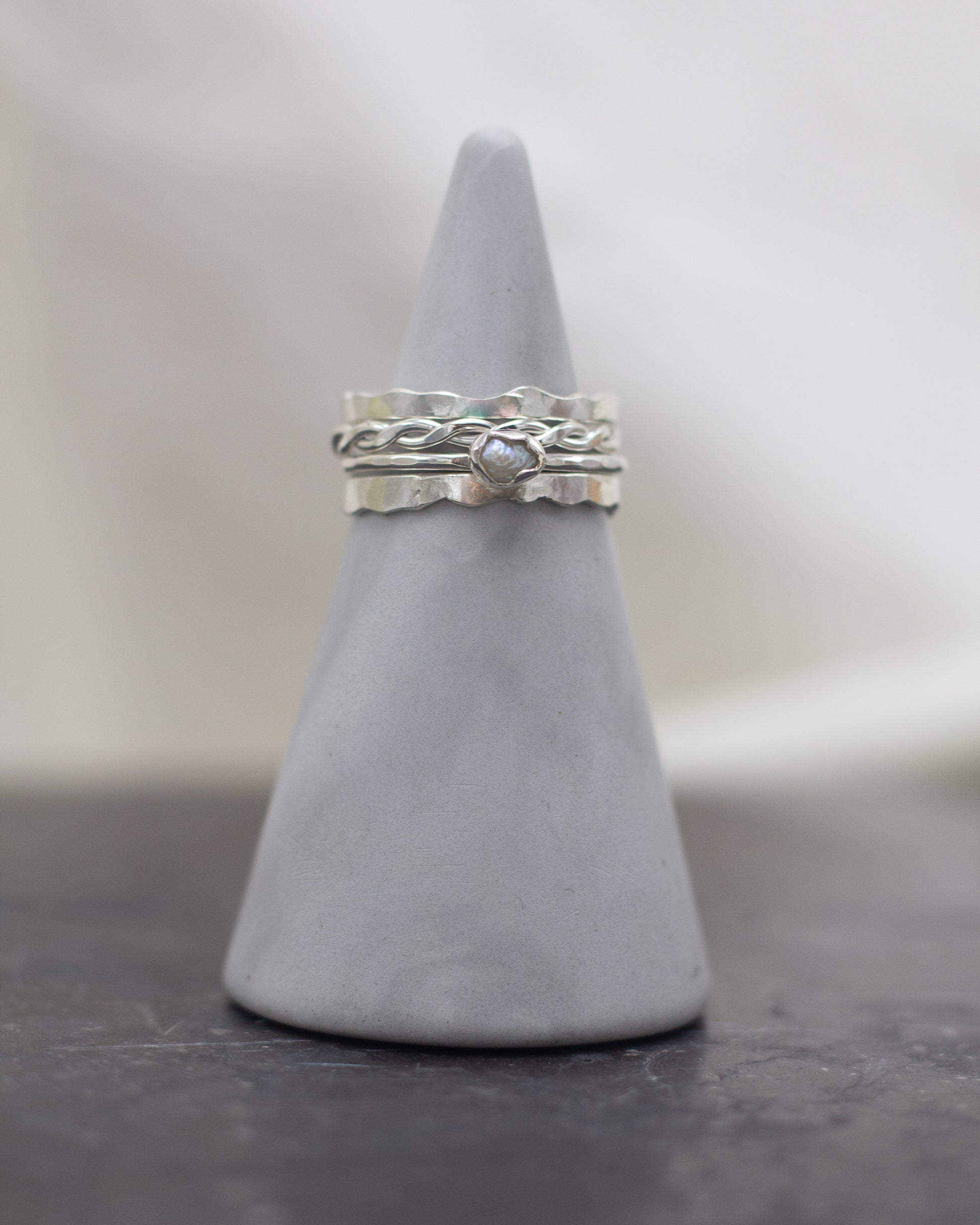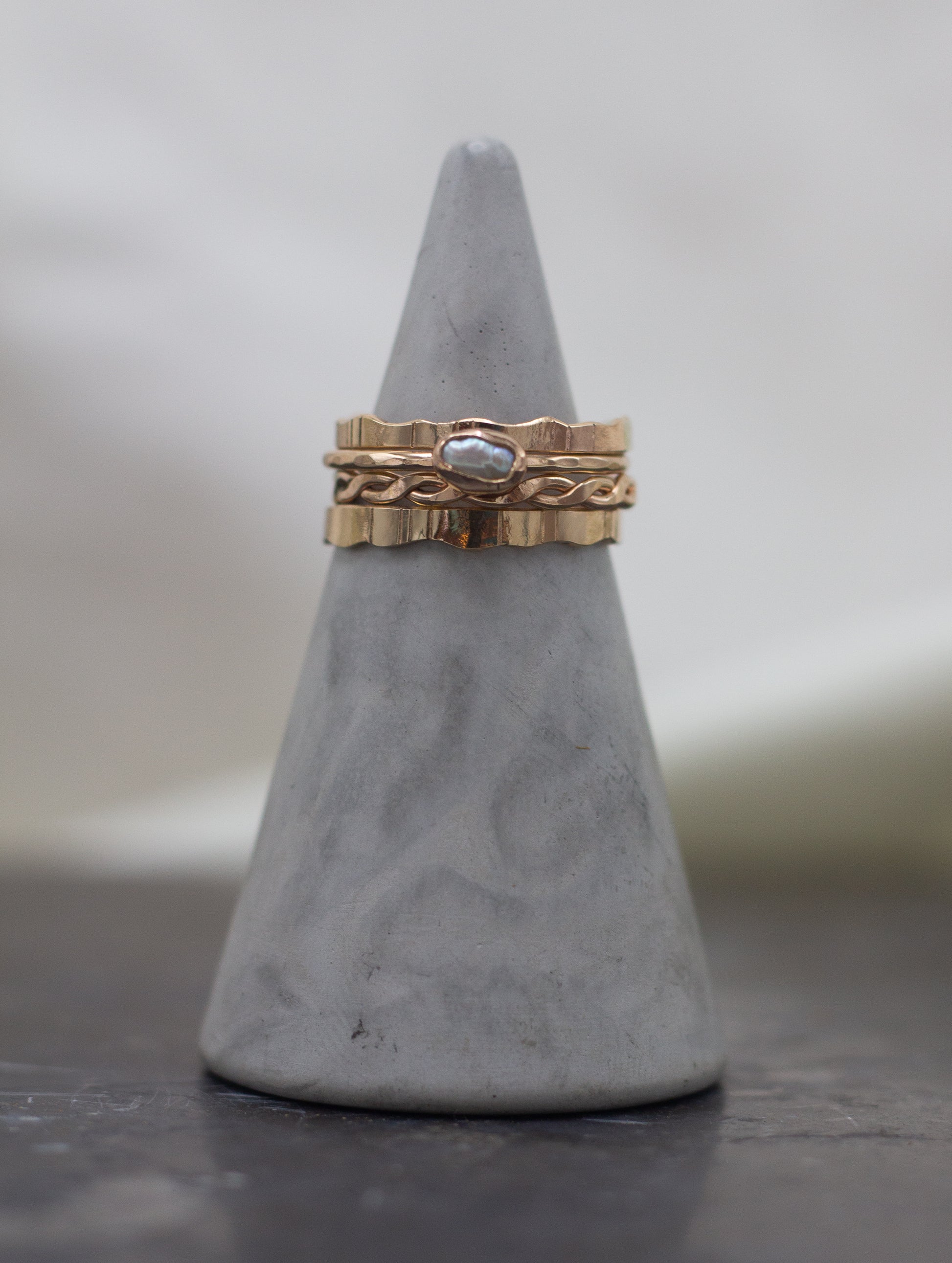 a single Japanese freshwater pearl set on a dainty band, paired with a twist ring and two interlocking stacking bands. Each ring is hand-built and every pearl is completely unique!