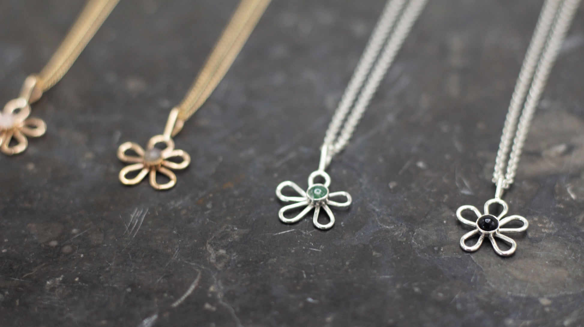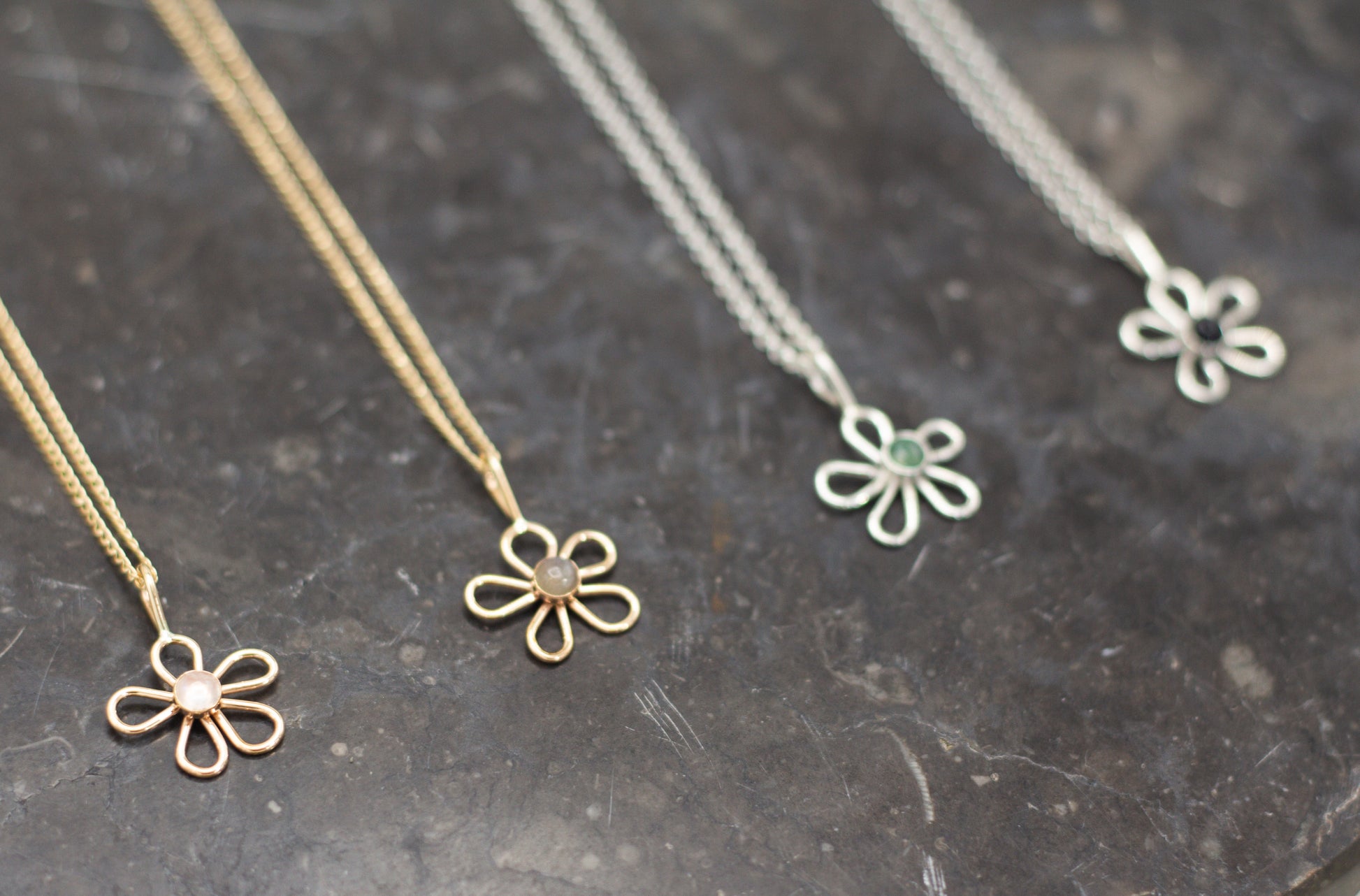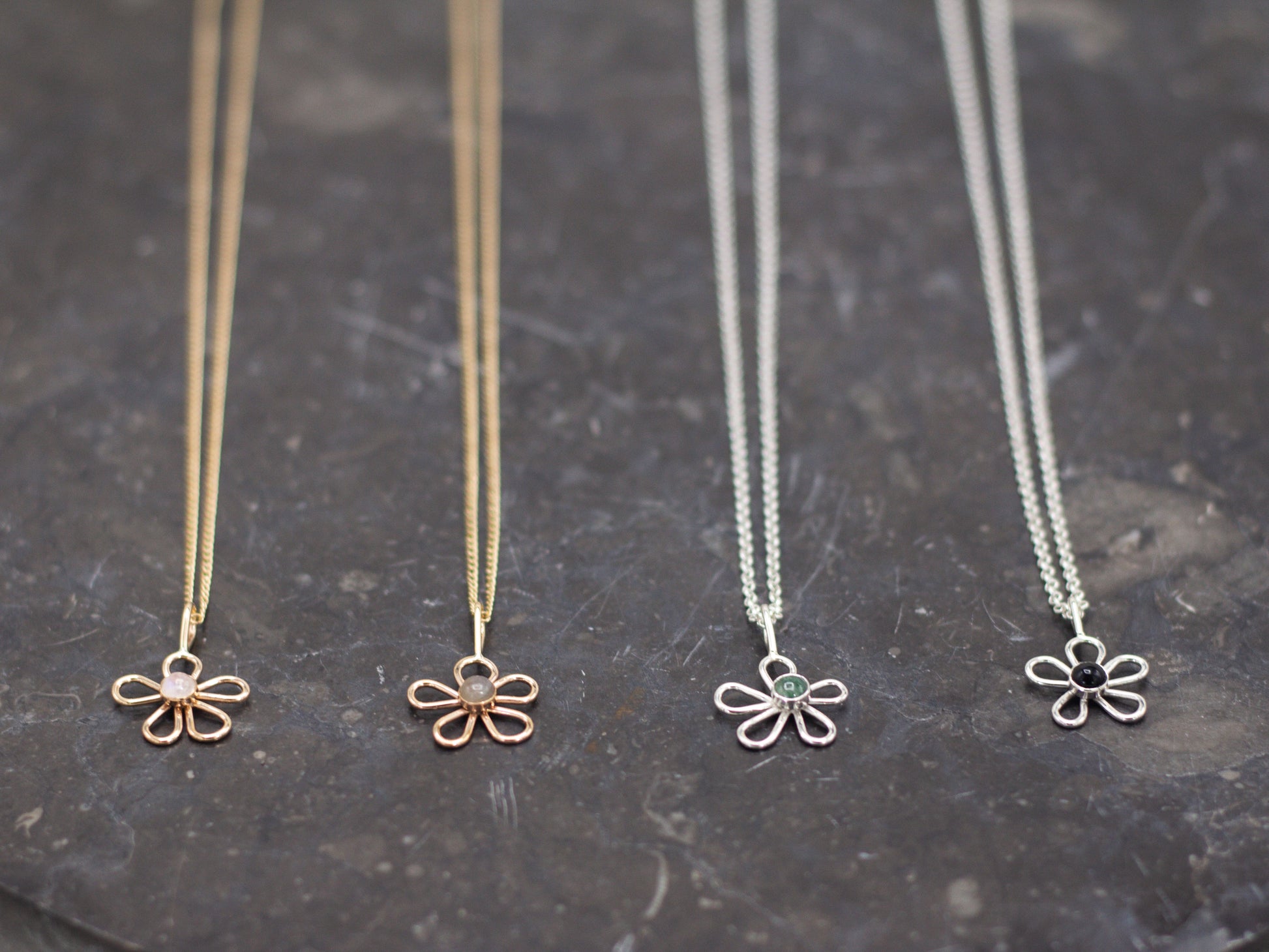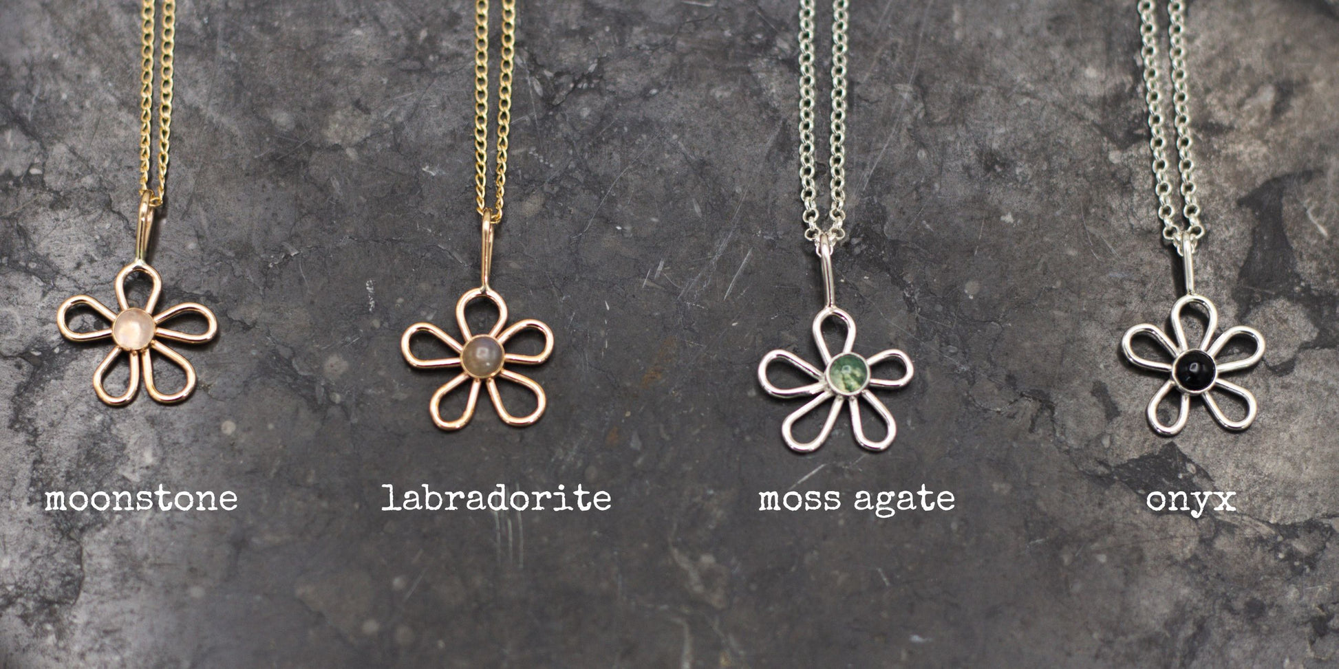 your choice of mini gem (onyx, moonstone, moss agate, or labradorite) set in a hand-built blossom pendant, dangling from a delicate chain.