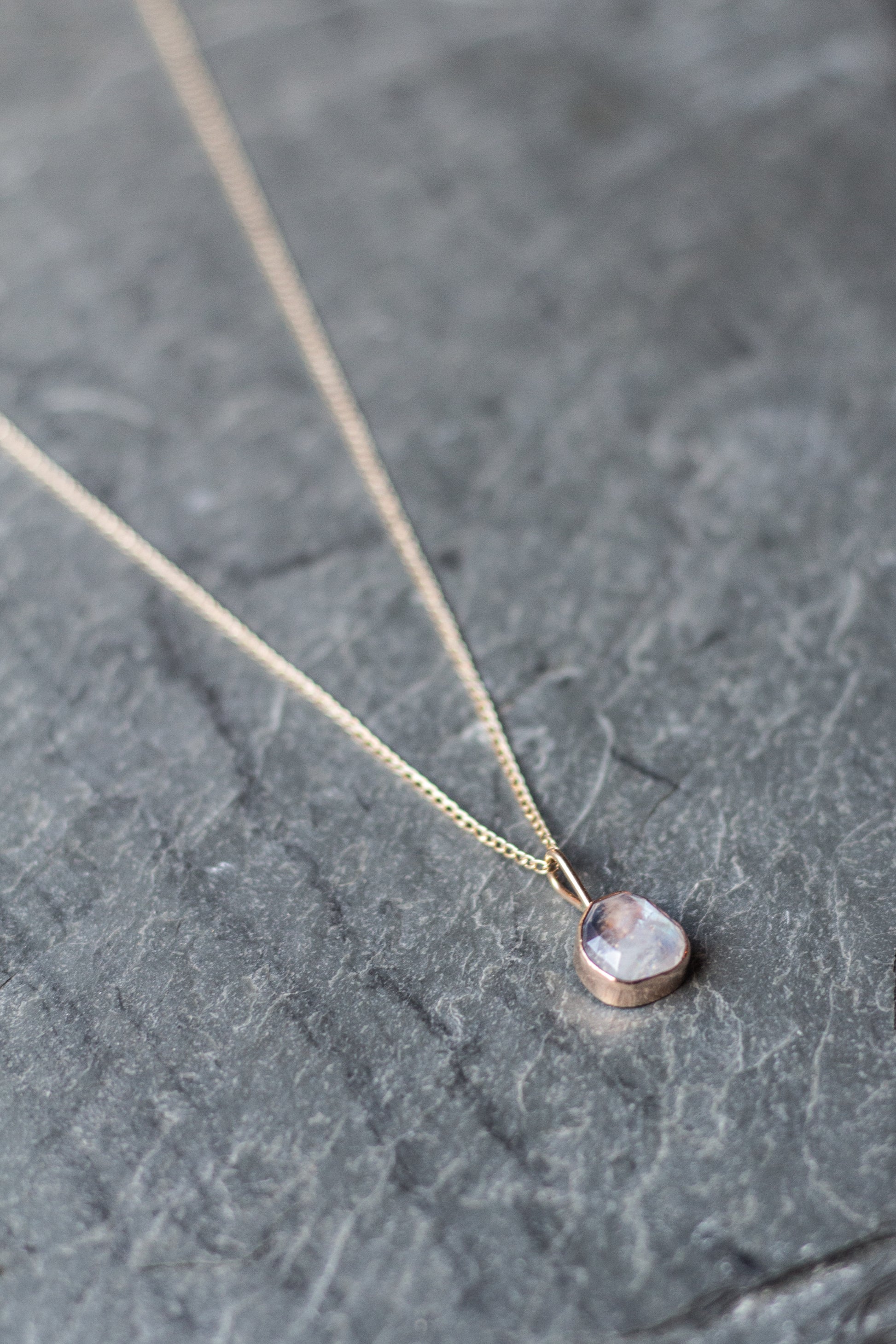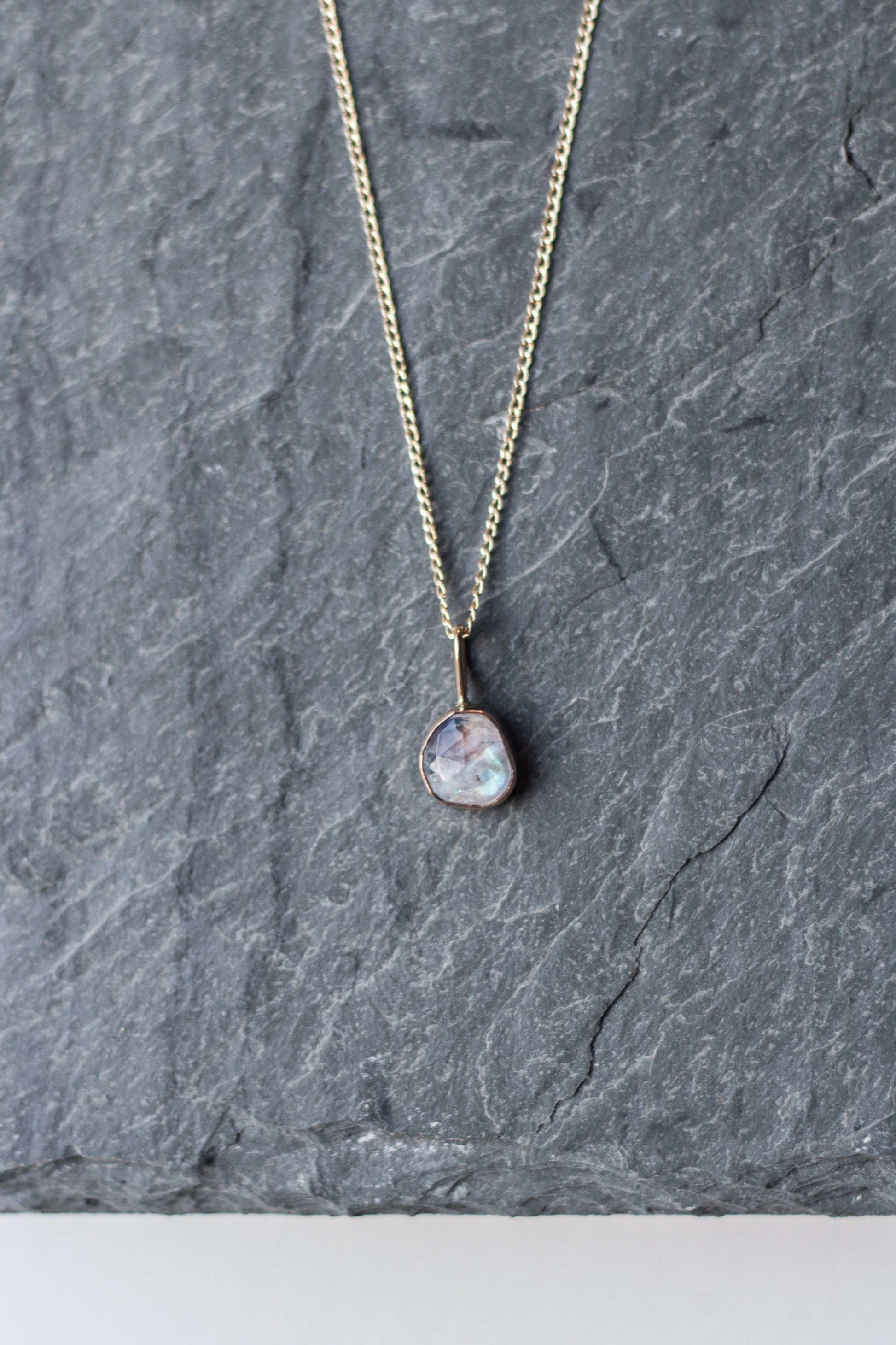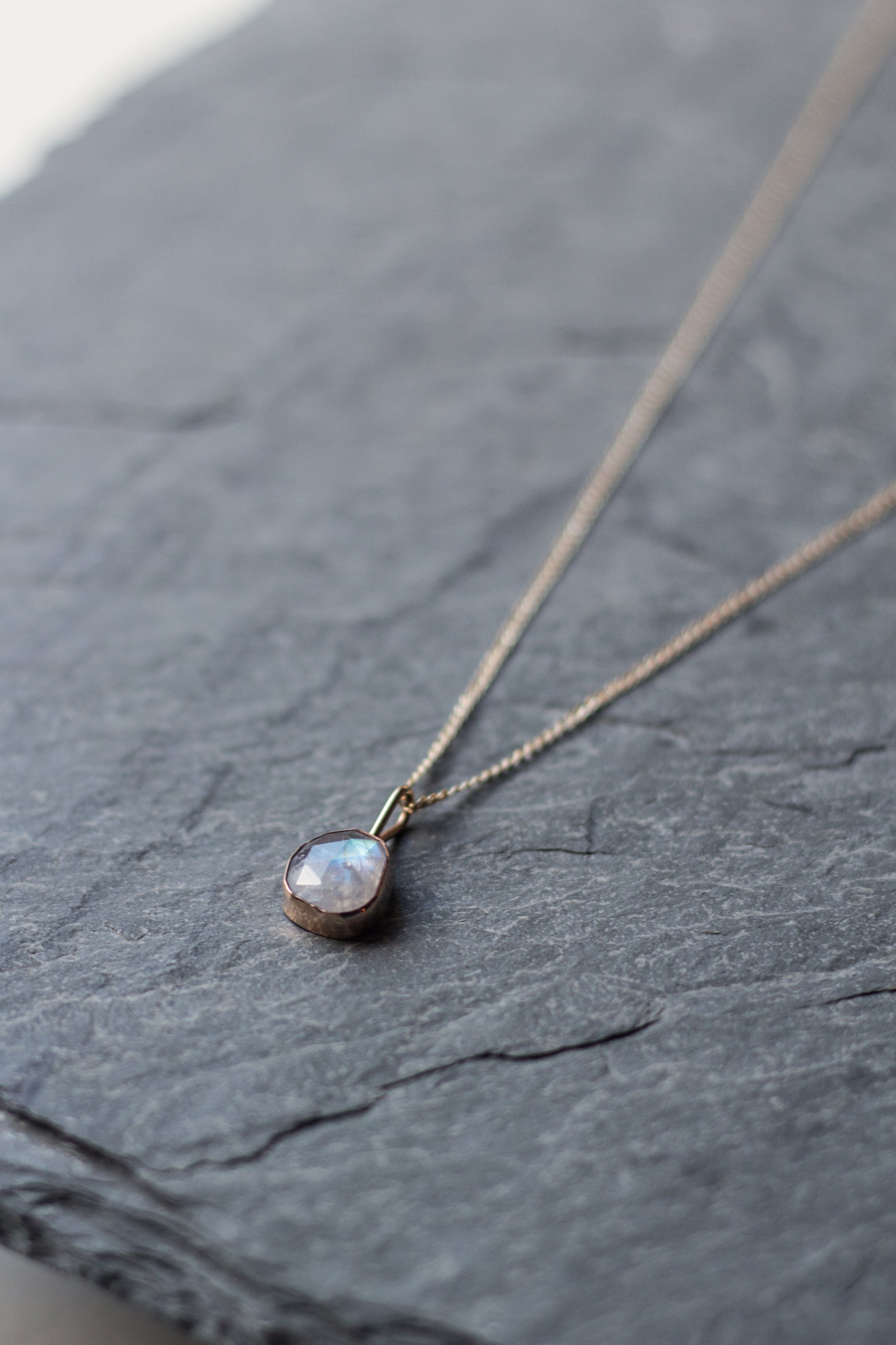 mini faceted moonstone set in a hand-built bezel, made with 14k gold-fill + dangling on an 18 inch 14k gold-fill chain