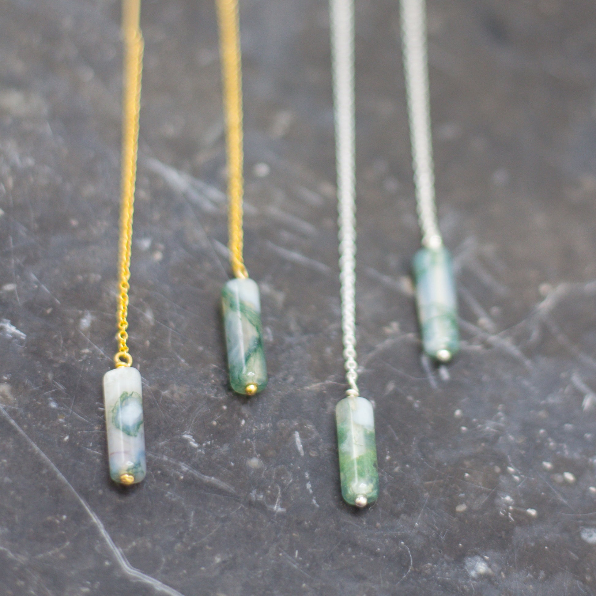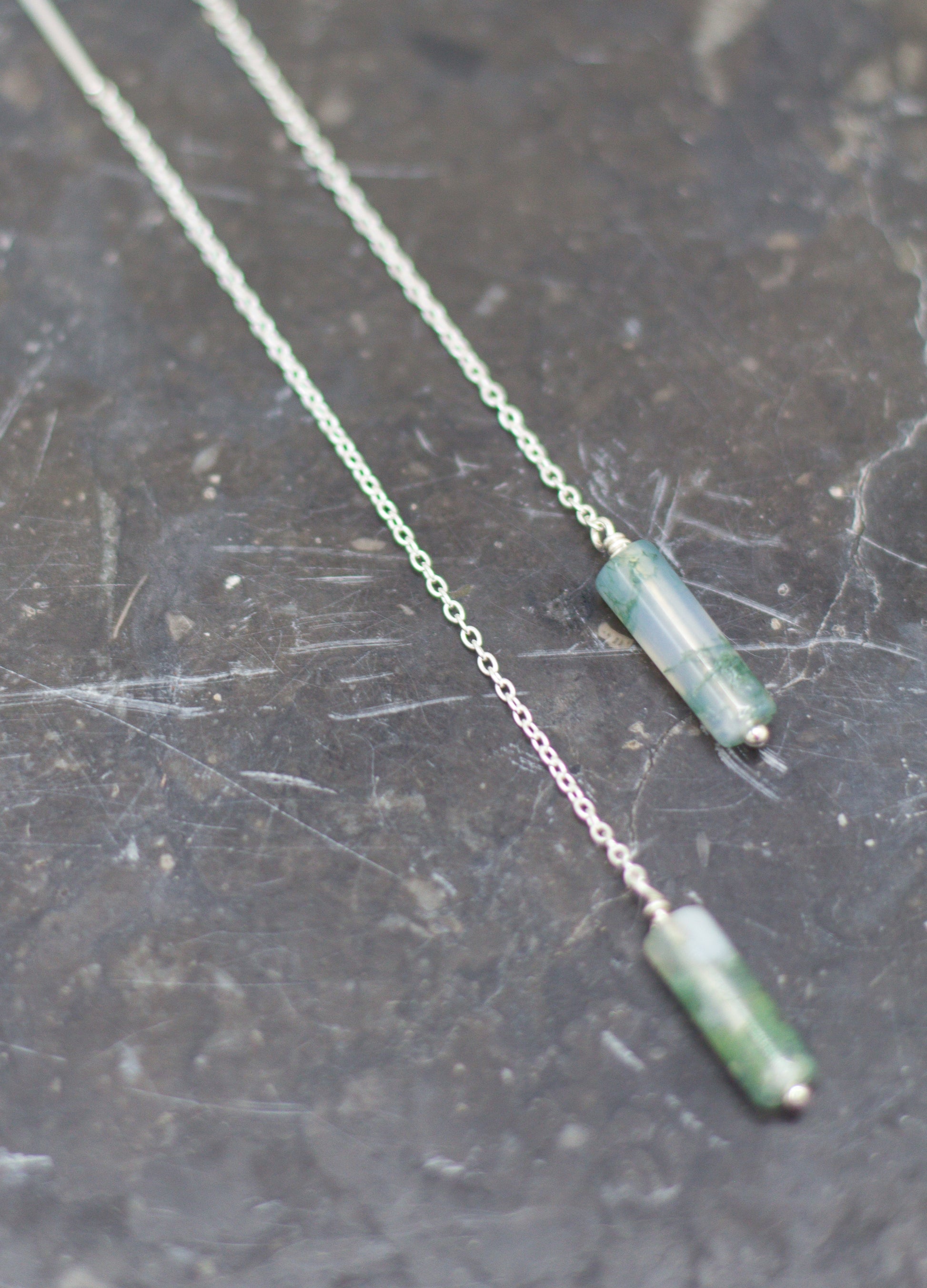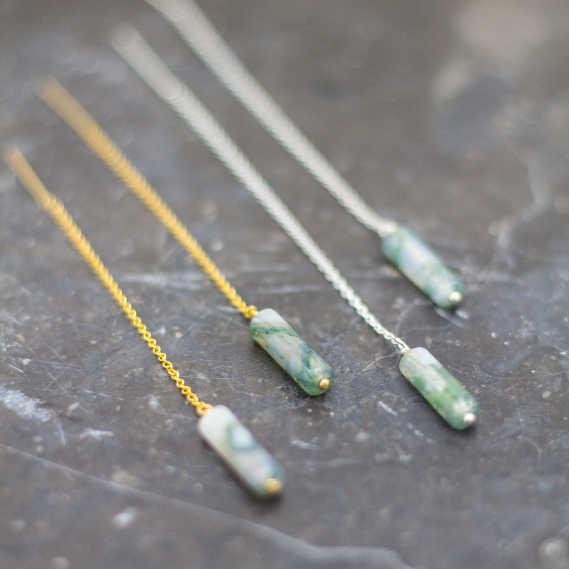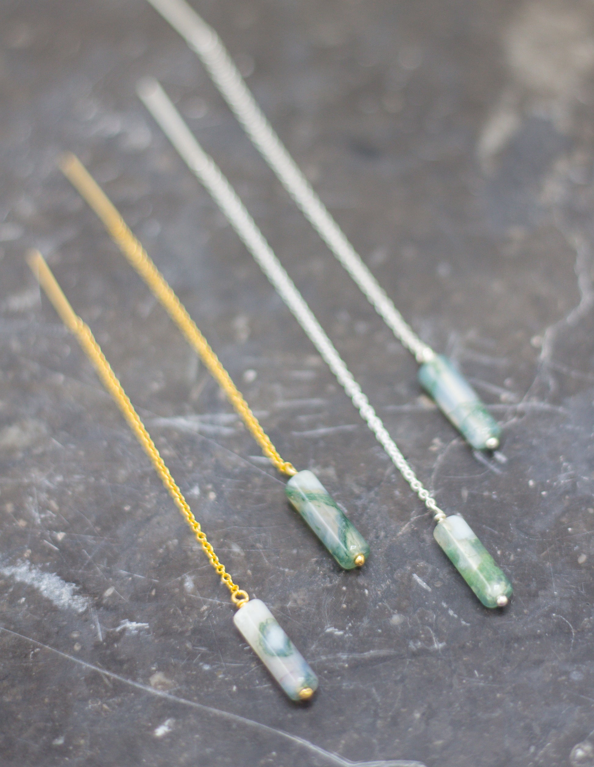 a moss agate bead dangles off a chain + post threader style, available in sterling silver or 14k gold fill