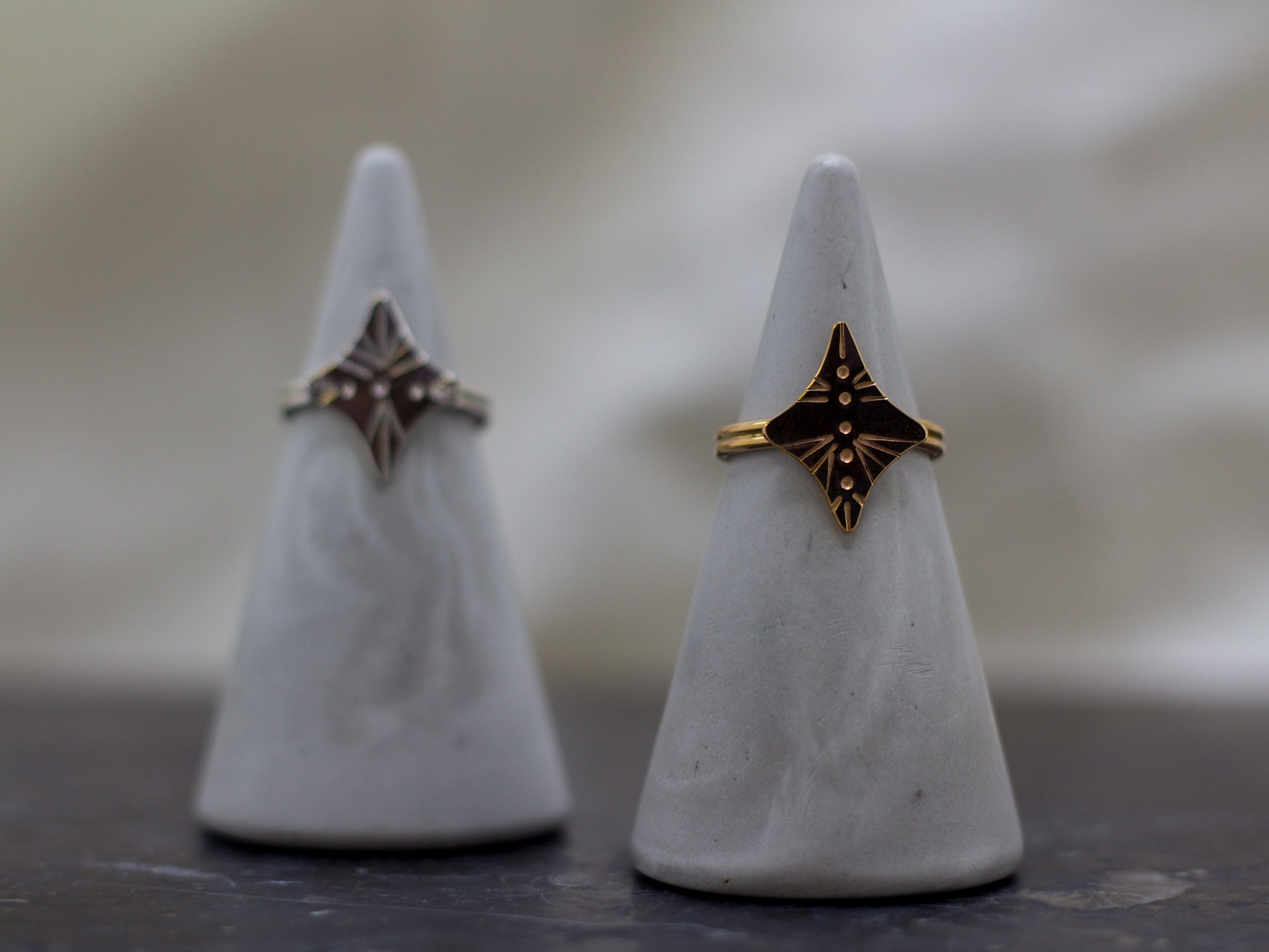 every north star ring is hand stamped with a one-of-a-kind pattern, so no two rings are ever the same.