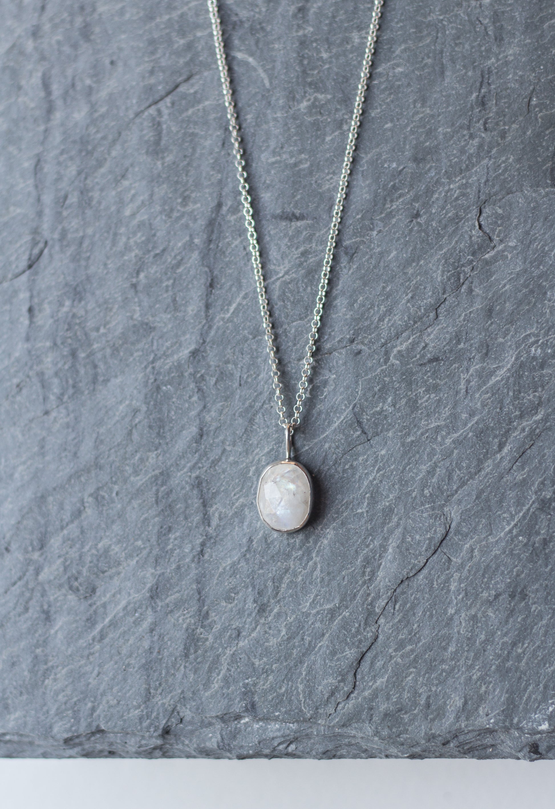 flashy rainbow moonstone set in a hand-built bezel, made with sterling silver + dangling on a sterling silver chain (adjustable between 16, 18 and 20 inches)