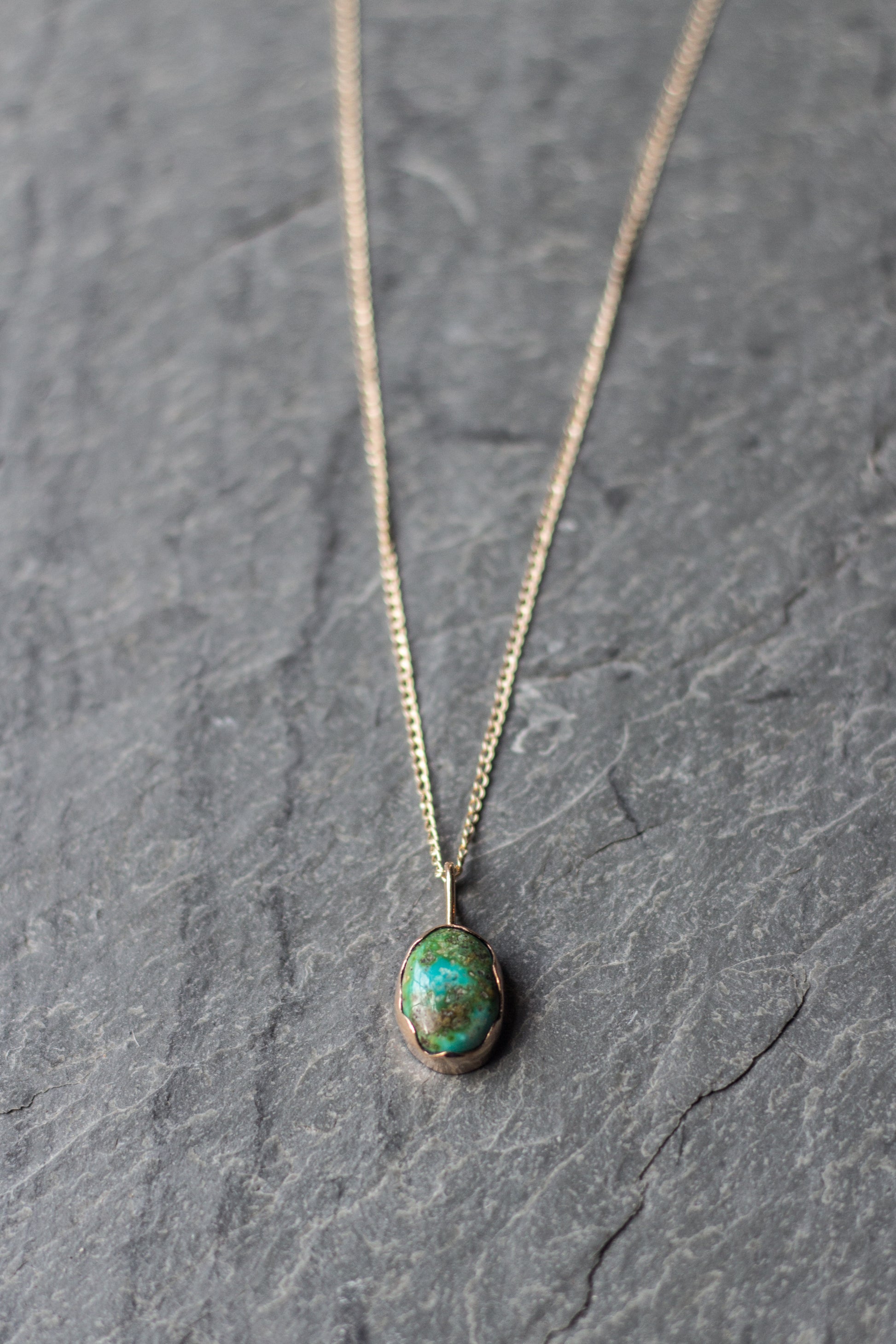 sonoran gold turquoise set in a hand-built bezel, made with 14k gold-fill + dangling on an 18 inch 14k gold-fill chain