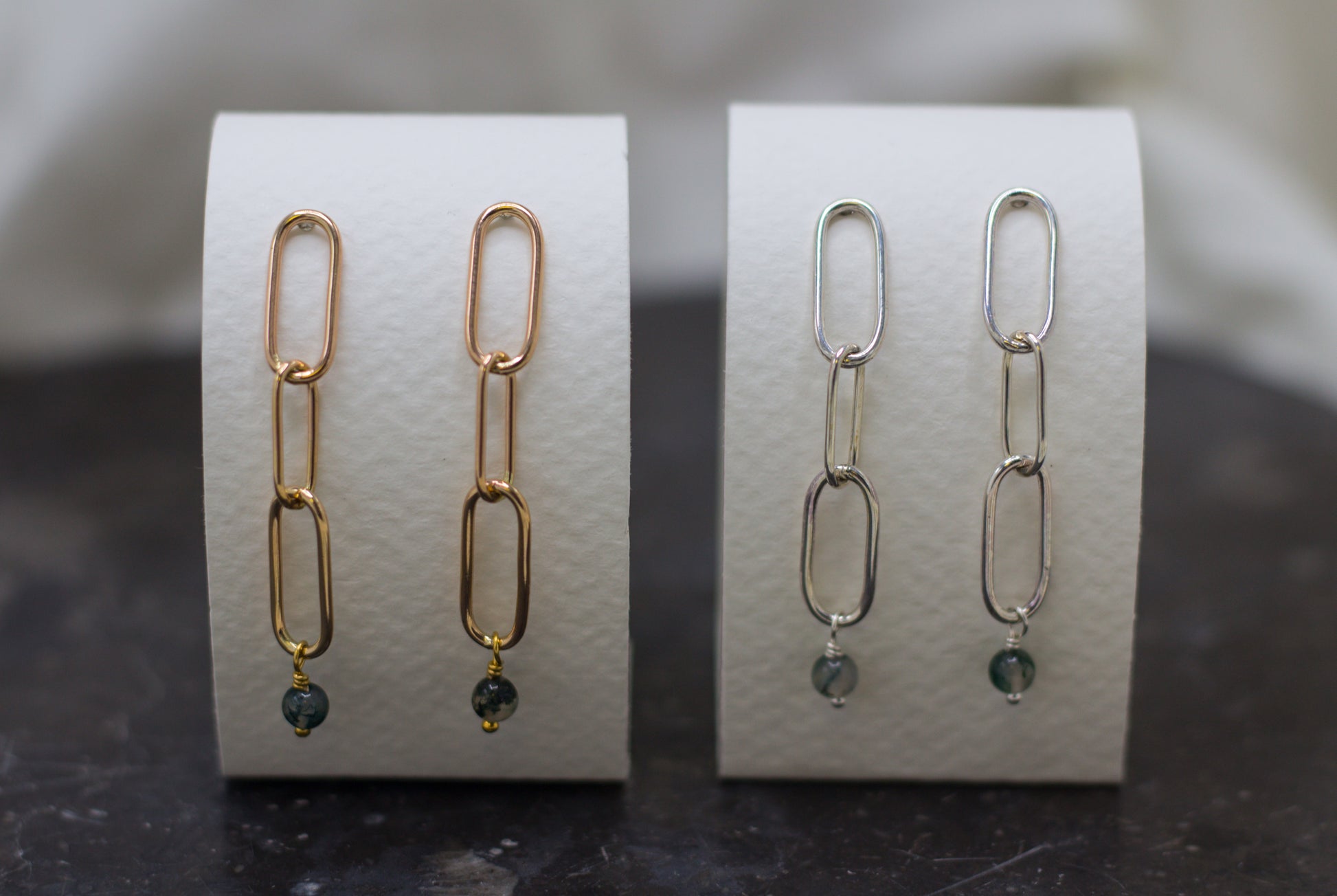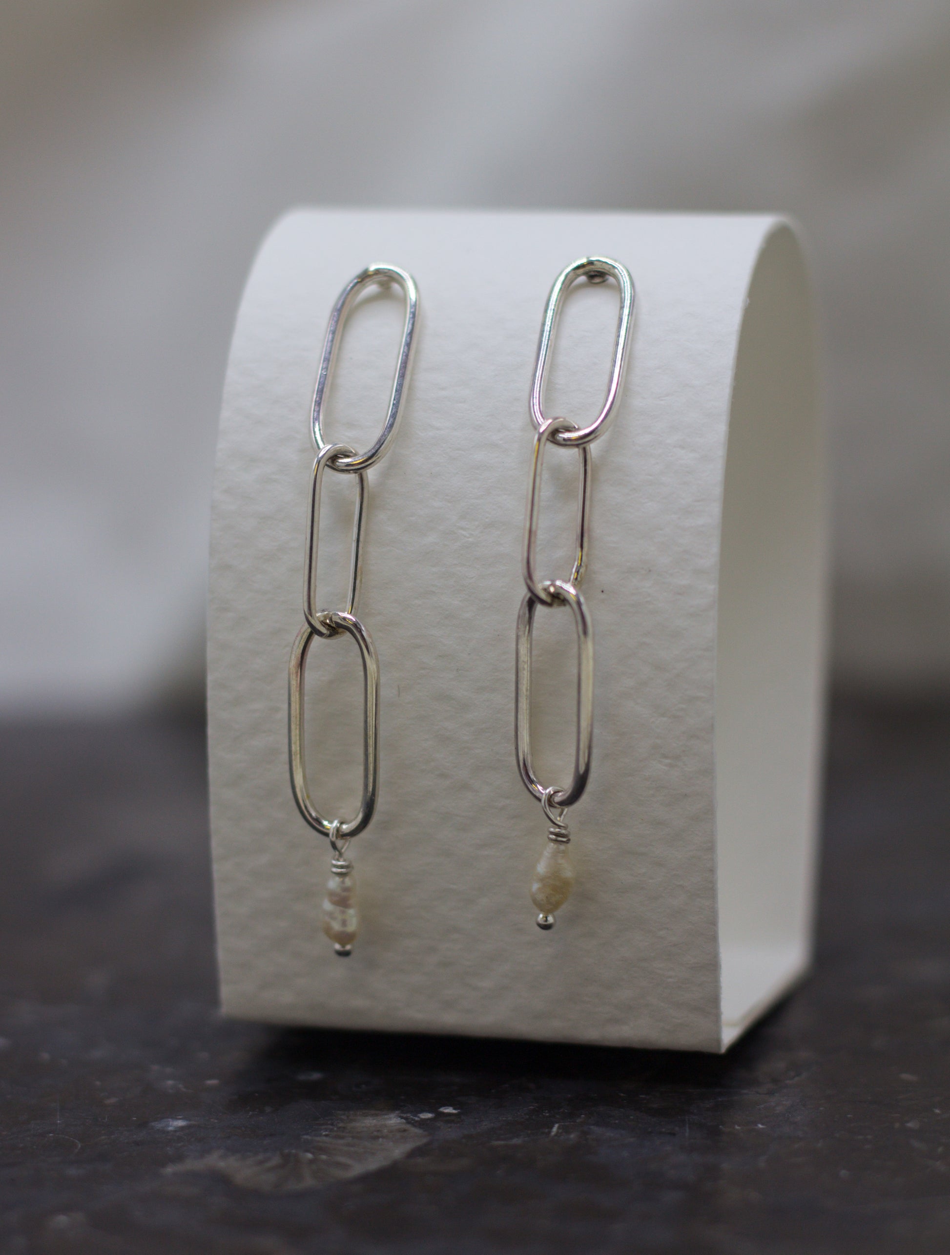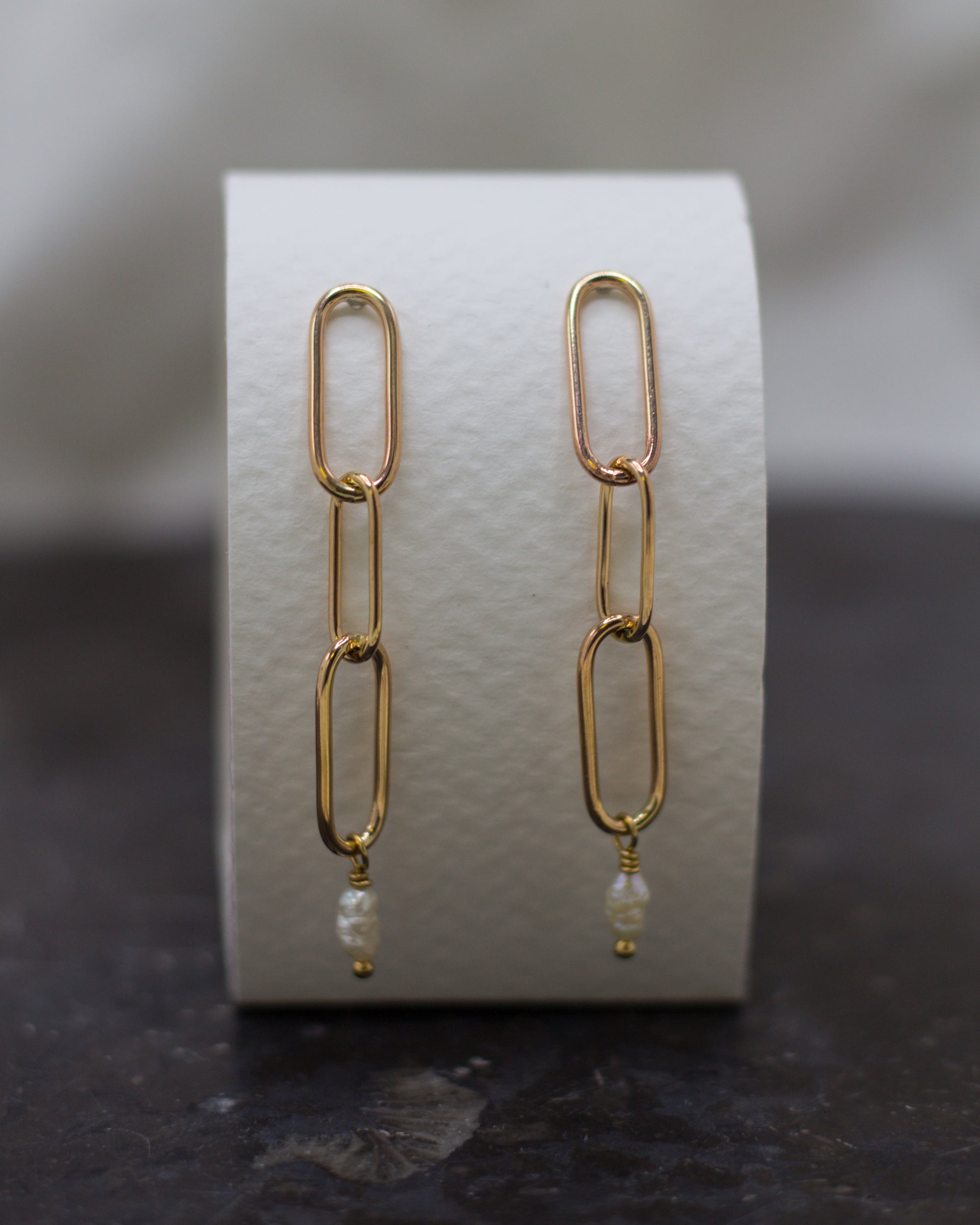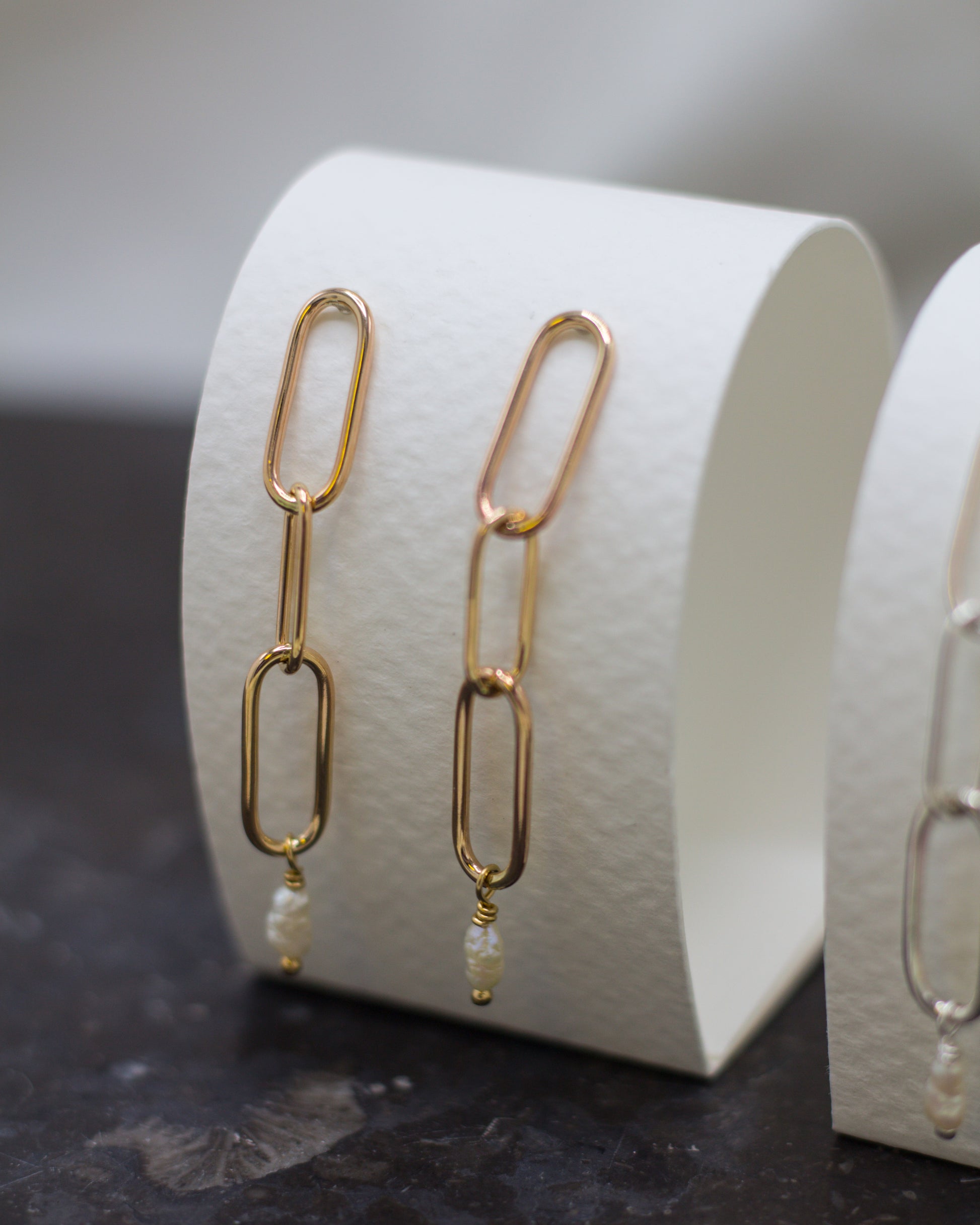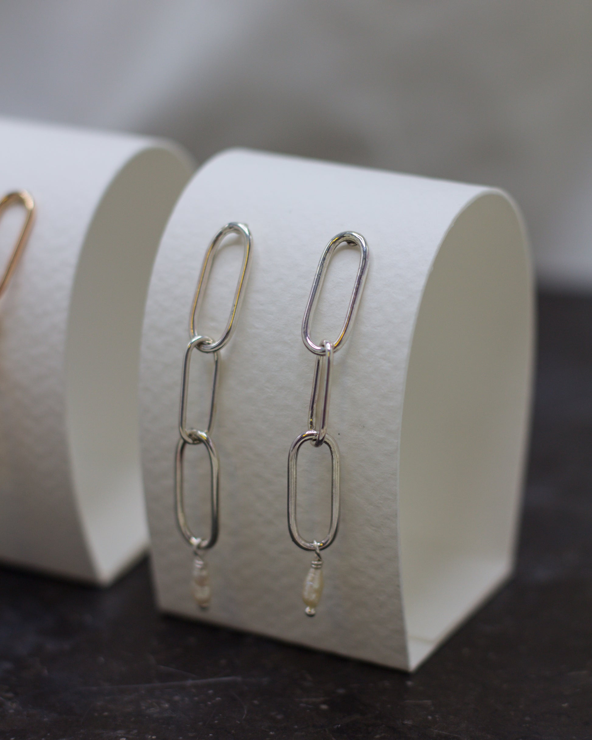 these three link studs are handmade with sterling silver or 14k gold-fill + a Japanese freshwater pearl dangles off the last link