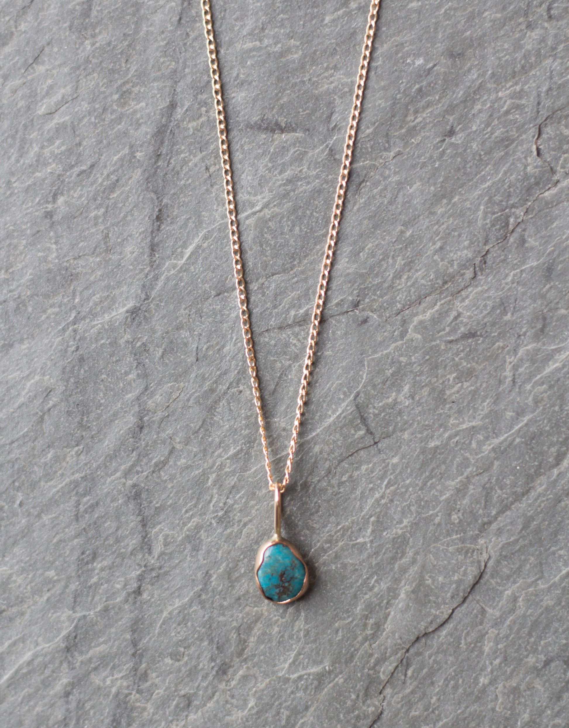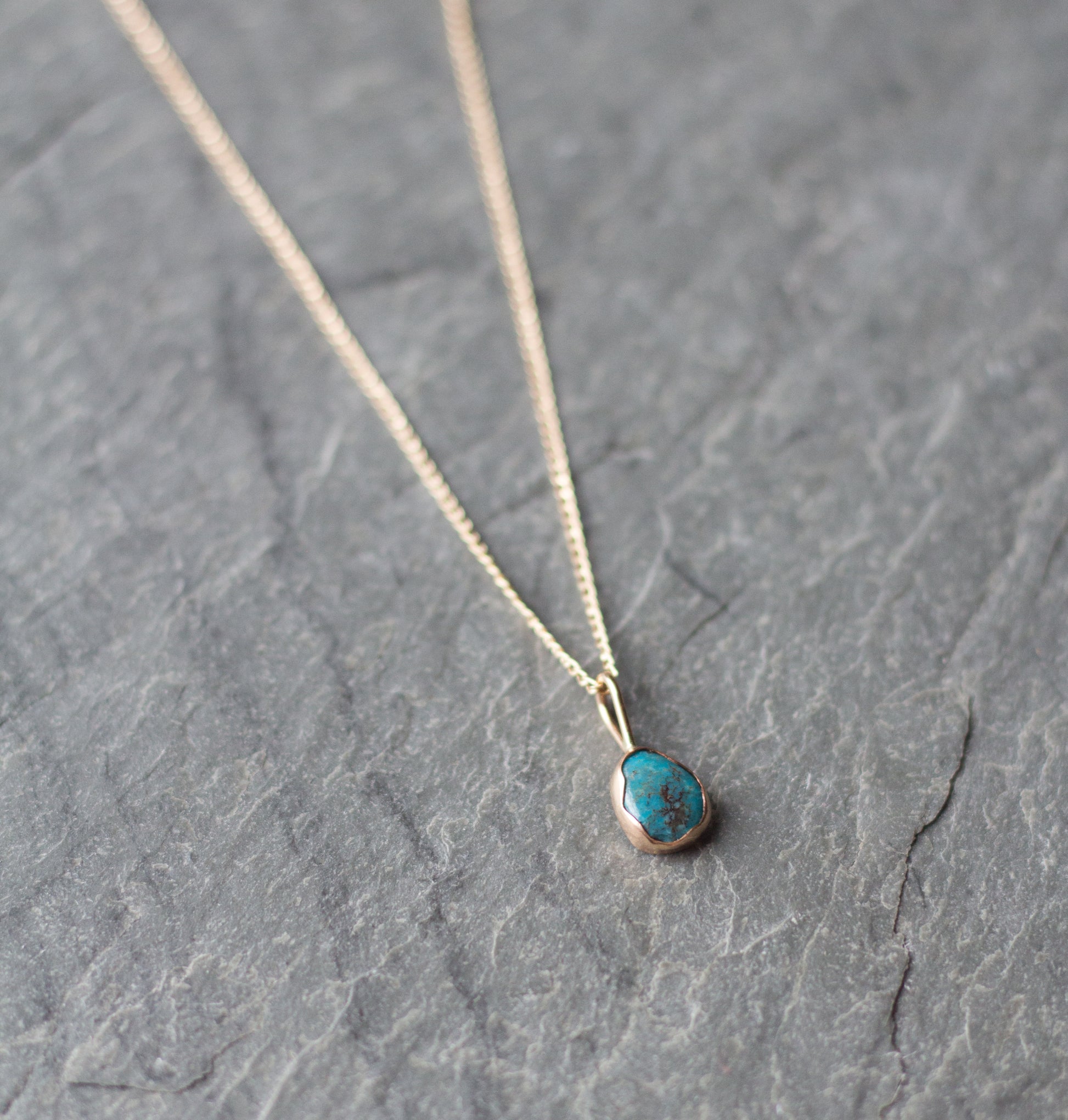 mystery turquoise pendant set in an organic edge bezel, dangling from a delicate chain that measures 18 inches long.